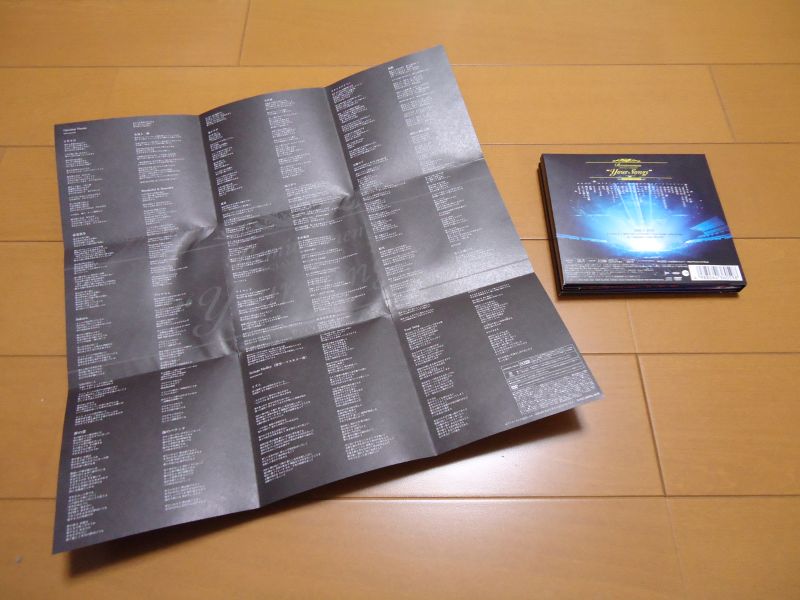 パチパチパチ 目が痛痒いという悲惨な状況の中 TSUTAYAに行って買ってきましたよ。 470ポイントもついたよ。 早速写真を撮りましたのでうpします! 右上:豪華3枚組! (うちCD2枚、DVD1枚) 左下:歌詞カード(ポスター裏)と 裏ジャケット。 ポスターはORS SHOPで買わなくてもついてるんやねー! よかったよかった。 Live Album「"Your Songs" with strings at Yokohama Arena」 2011.04.27 ■初回生産限定盤[2CDs+DVD]■ AVCO-36059/60B ¥4,800(tax in) 紙ジャケット仕様 ■通常盤[2CDs]■ AVCO-36061/62 ¥2,800(tax in)